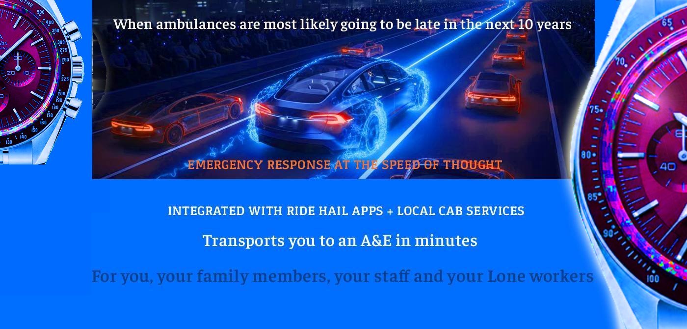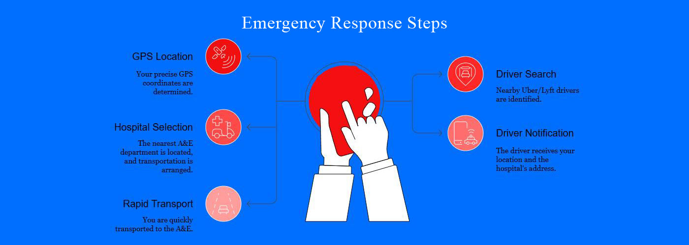 With full integration of Uber, Lyft (beta), our app calculates real-time GPS locations of you, nearby drivers, and your nearest A&E aiming for quickest route, shaving 8-12 critical minutes off emergency transport time and with our Cascading triage upto 30 Mins. Use our App to protect your family and your employees(HSE Compliance).