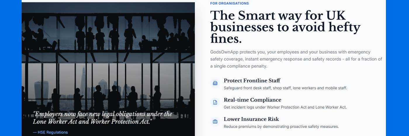 Employers now face new legal obligations under the Lone Worker Act and Worker Protection Act, with fines running into thousands for non-compliance. GodsOwnApp protects you, your employees and your business with emergency safety coverage, instant emergency response and safety records - all for less than a fraction of a single compliance penalty.